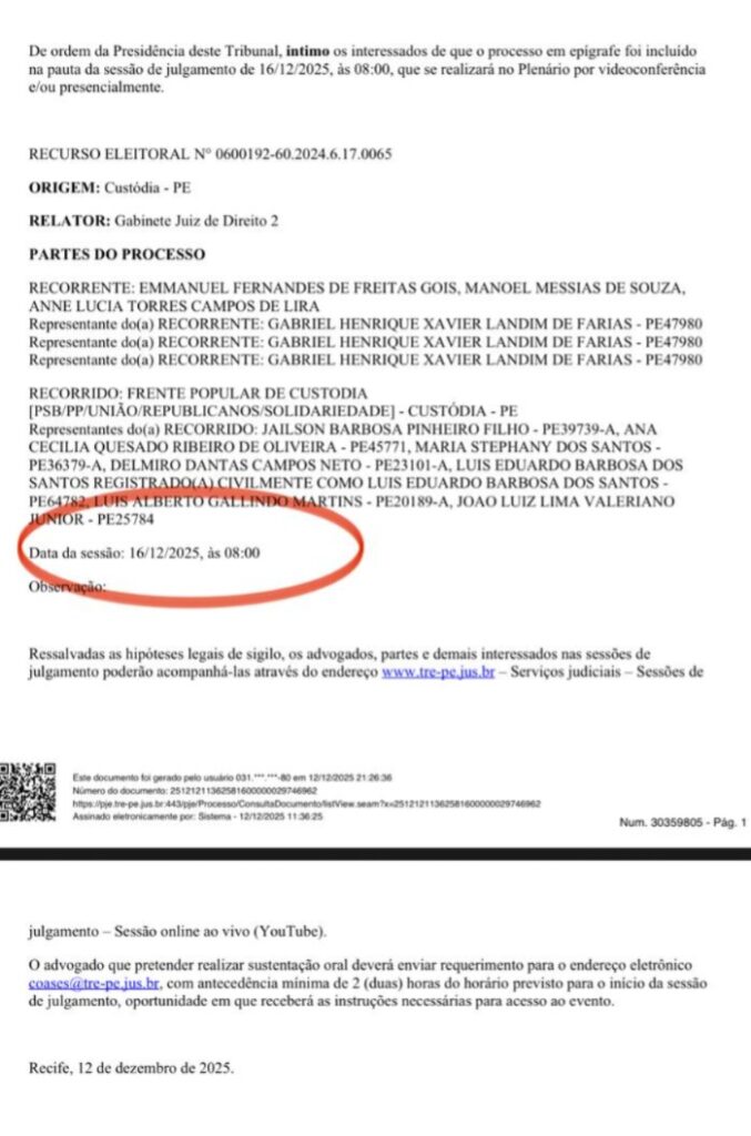 O Tribunal Regional Eleitoral de Pernambuco (TRE-PE) incluiu na pauta de julgamento desta terça-feira (16) um recurso eleitoral relacionado à Ação de Investigação Judicial Eleitoral (AIJE) que apura supostas práticas de abuso de poder político e econômico no município de Custódia, no Sertão do Moxotó. A sessão está prevista para ocorrer no plenário do tribunal, por videoconferência, conforme intimação expedida pela Presidência da Corte. Entre os investigados estão o ex-prefeito de Custódia e atual secretário de Desenvolvimento Profissional e Empreendedorismo de Pernambuco (Sedepe), Emmanuel Fernandes, conhecido como Manuca de Zé do Povo (PSD). Também o prefeito Manoel Messias, o Messias do Dnocs (PSD), e a vice-prefeita Anne Lira (MDB).
