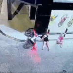 Imagens de câmeras de segurança mostram a motociclista trafegando com uma passageira na garupa quando, de forma repentina, segue em linha reta e bate com força contra o estabelecimento comercial. Com o impacto, os capacetes das duas ocupantes se soltaram, e a motocicleta permaneceu ligada mesmo após a queda, tombando ao lado das vítimas.