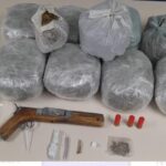 Ao chegar à residência indicada, os policiais não encontraram o suspeito, mas se depararam com dez bolas grandes de maconha, pesando 8,668 kg. Além de uma espingarda calibre 12 com três cartuchos intactos, embalagens para drogas e uma balança de precisão.