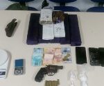 Após ser contido, a bolsa foi recuperada. Nela, estavam um revólver calibre .38, nove munições do mesmo calibre. Além disso, duas balanças de precisão, 347 gramas de maconha e 48 gramas de cocaína. Dentro do imóvel, os policiais ainda encontraram outros celulares — incluindo o destruído — e R$ 360 em espécie.