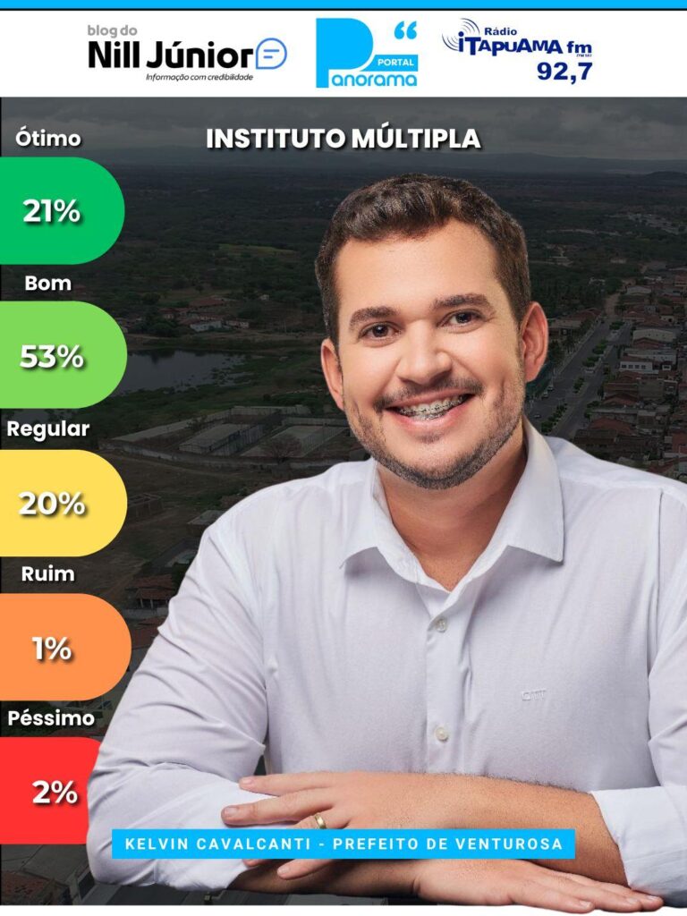 O Instituto Múltipla divulgou os resultados da aprovação ao Prefeito Kelvin Cavalcanti (PSD), de Venturosa. Ele mantém índice de aprovação acima dos 80%, com 82% que dizem aprovar sua gestão. É o que diz pesquisa do Instituto Múltipla, em parceria com o Portal Panorama, Blog Nill Júnior e Itapuama FM.
