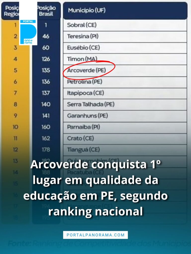 Arcoverde é primeiro lugar em educação – O Centro de Liderança Pública (CLP) divulgou o resultado do Ranking de Competitividade dos Municípios 2025. Nele, Arcoverde se destacou como a cidade com melhor qualidade da educação em Pernambuco. No cenário regional, o município ficou em 5º lugar no Nordeste, superando importantes centros como Recife, Petrolina e Caruaru.