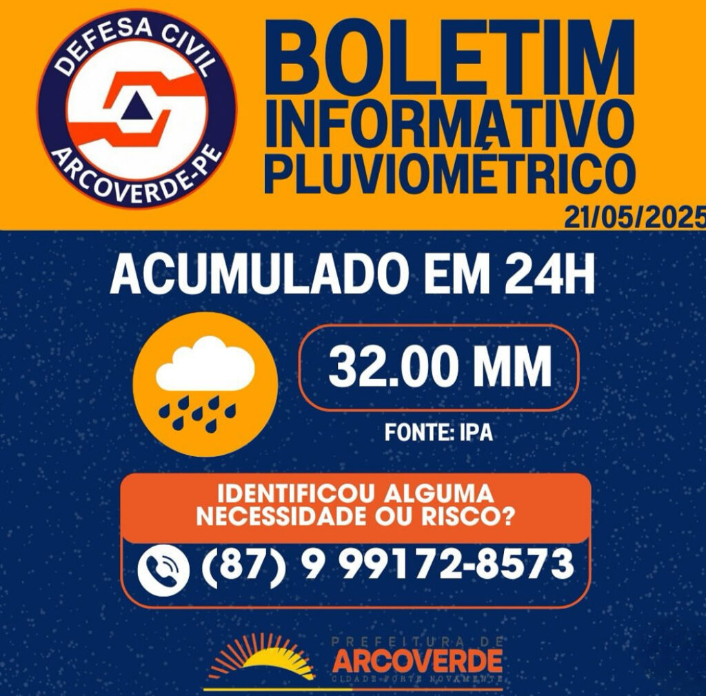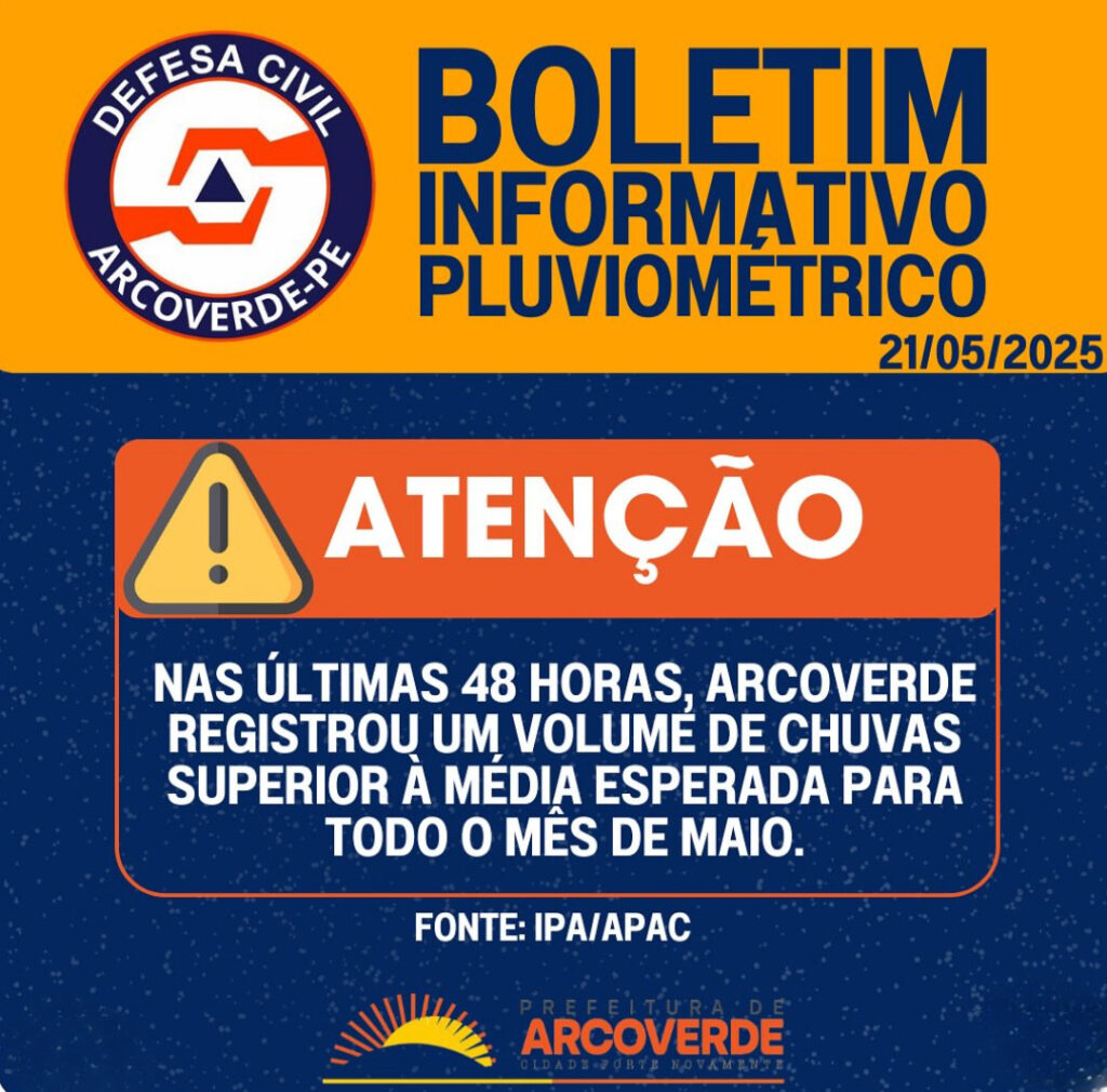 A Defesa Civil de Arcoverde divulgou, nesta quarta-feira (21), um novo boletim pluviométrico que chama a atenção para o alto volume de chuvas registrado no município. Embora o mês de maio ainda não tenha terminado, os dados indicam que o acumulado nas últimas 48 horas chegou a 85,40 mm, superando a média mensal esperada para o período, conforme levantamento da APAC (Agência Pernambucana de Águas e Clima).
