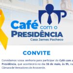 A Câmara de Vereadores de Arcoverde, Casa Jaime Pacheco, convida toda a população para participar do “Café com a Presidência”, que será realizado no próximo dia 16 de maio, às 9h. O encontro faz parte da campanha Maio Amarelo, mês voltado à conscientização e prevenção de acidentes de trânsito.