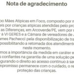O grupo Mães Atípicas em Foco, formado por mães e responsáveis por crianças atendidas pelo programa Um Olhar para as Diferenças, em Arcoverde, divulgou nesta terça-feira (11) uma nota pública de agradecimento à VI Gerência Regional de Saúde (VI Geres) e à Câmara de Vereadores de Arcoverde.