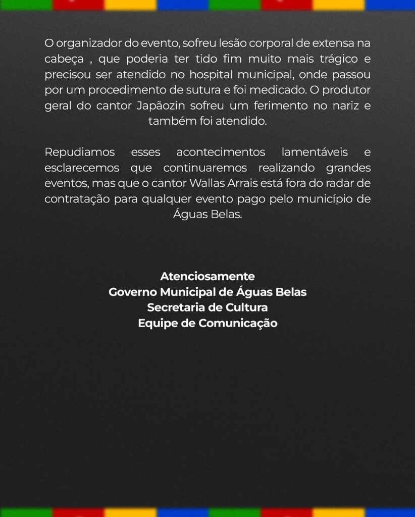 Por fim, a gestão municipal repudiou o ocorrido, criticando a falta de profissionalismo do artista, que, segundo a nota, deveria ter garantido um ambiente pacífico, mas acabou contribuindo para uma noite marcada por confusão e violência — colocando em risco artistas, equipe técnica, imprensa, famílias e até crianças que aguardavam no backstage.