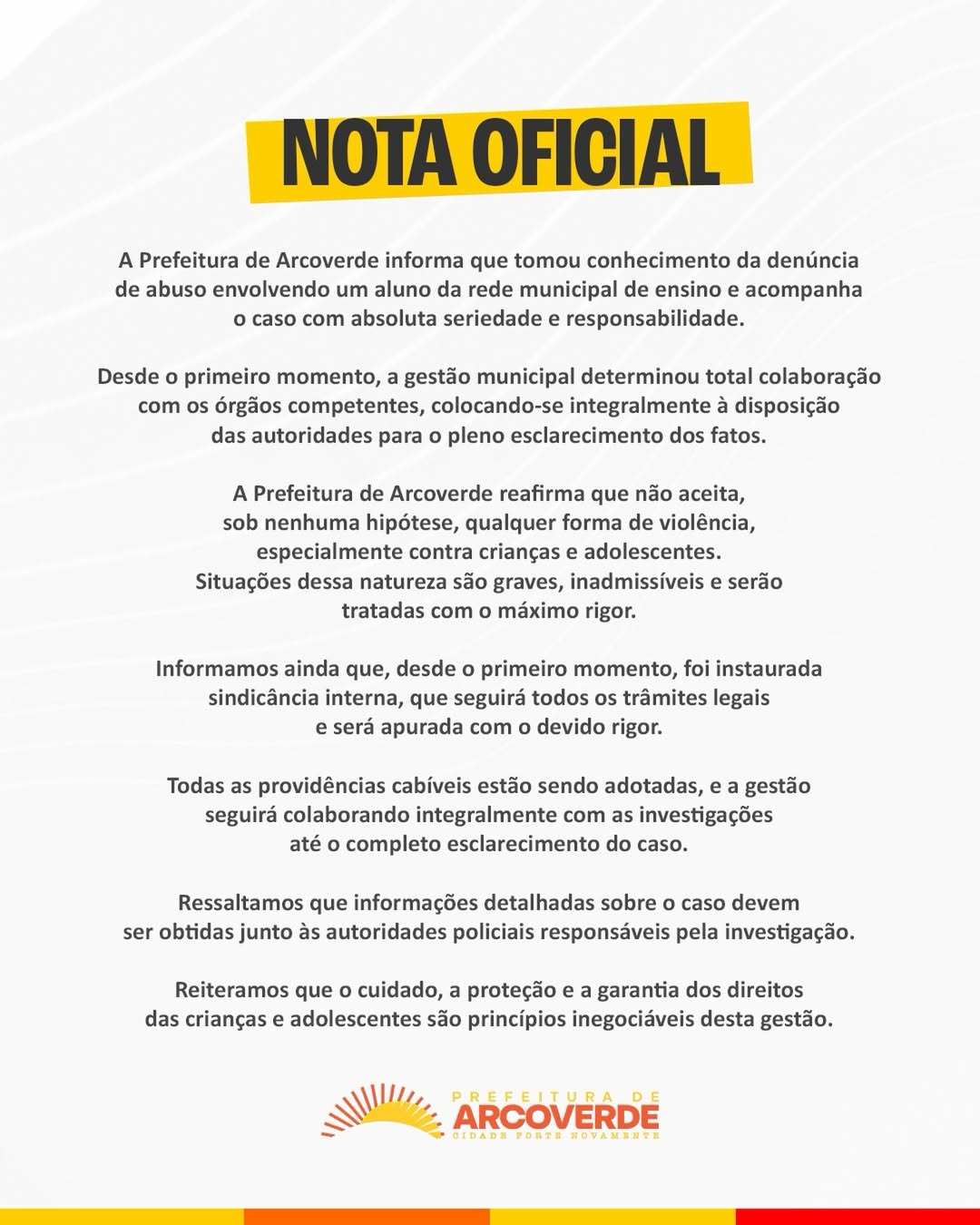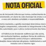 “A Prefeitura de Arcoverde informa que tomou conhecimento da denúncia de abuso envolvendo um aluno da rede municipal de ensino e acompanha o caso com absoluta seriedade e responsabilidade.