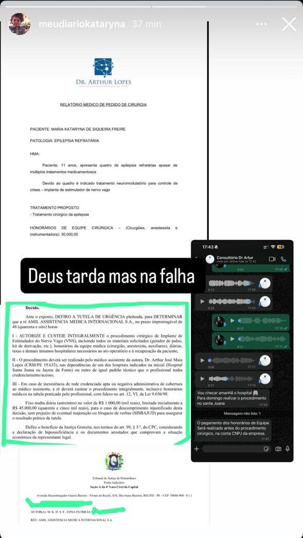 Apesar da conquista, a família enfrenta desafios financeiros adicionais. Nesse sentido, os valores relativos aos honorários dos cirurgiões, anestesistas e instrumentadores somam custo elevado. E esse valor não está sendo coberto integralmente pelo plano. Por isso, a mãe recorreu à solidariedade pública e compartilhou documentos que atestam a urgência, bem como a gravidade da condição da criança.