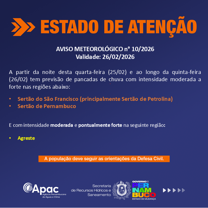 Diante desse cenário, a Agência Pernambucana de Águas e Clima (Apac) emitiu, ao final da quarta-feira, um aviso meteorológico de atenção com validade até a quinta (26). De acordo com o órgão, a previsão indica a continuidade das chuvas. Nesse sentido, que devem variar de moderadas a fortes no Sertão de Pernambuco e no Sertão do São Francisco, especialmente em Petrolina.