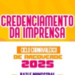 Com o objetivo de simplificar o processo, a Prefeitura optou por um Credenciamento Único, que valerá então para toda a cobertura do Ciclo Carnavalesco de Arcoverde 2025. O cronograma de eventos inclui: