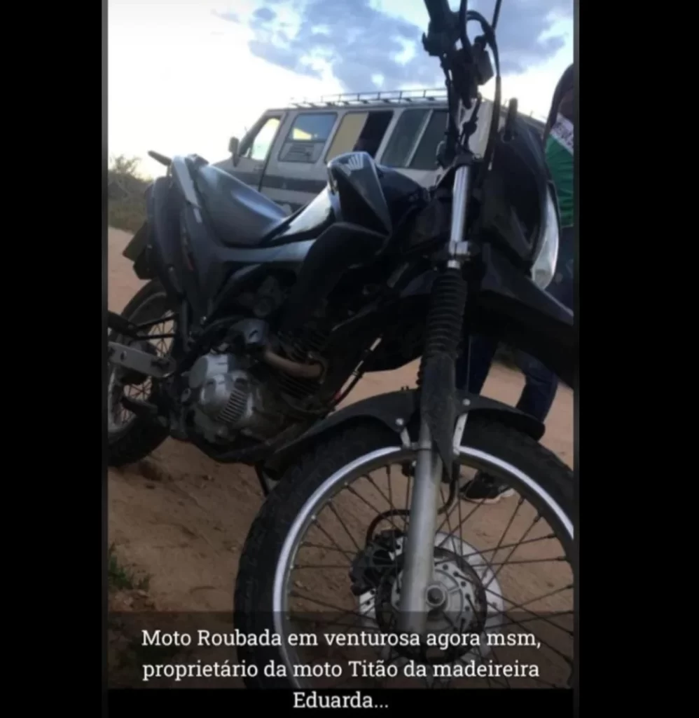 Uma moto Honda Bros, de cor preta e placa PCM6F71, foi furtada na cidade de Venturosa, na tarde desta segunda-feira (28). O veículo pertence ao empresário conhecido como Tita da Madeireira Eduarda.