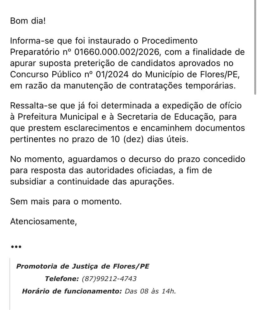 A investigação concentra-se, principalmente, na manutenção de contratações temporárias mesmo com o concurso homologado. Além de ainda estar dentro do prazo de validade. Diante disso, o MPPE determinou a expedição de ofícios à Prefeitura de Flores e à Secretaria Municipal de Educação. Dessa forma, solicitando esclarecimentos e o envio de documentos pertinentes no prazo de 10 dias úteis.