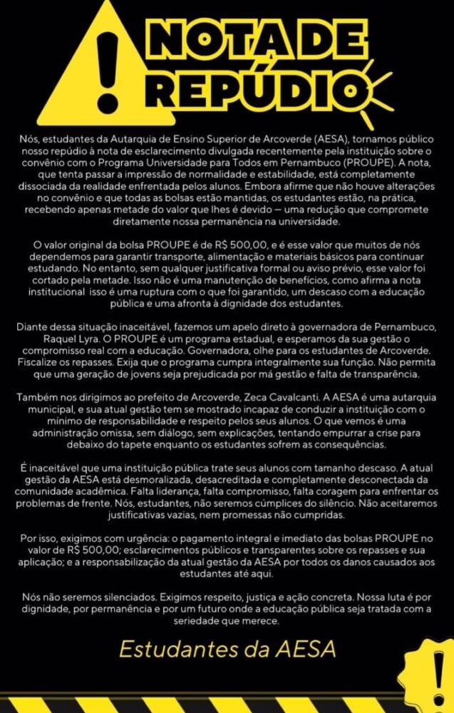 Anda mais, embora a crítica principal seja direcionada à gestão da Aesa, os estudantes também cobram uma postura mais ativa do prefeito de Arcoverde, Zeca Cavalcanti (Podemos). Com isso, eles afirmam que, como chefe do Executivo local e responsável pela autarquia, o prefeito deve intervir com urgência. “A atual gestão tem se mostrado incapaz de conduzir a instituição com o mínimo de responsabilidade e respeito pelos seus alunos”, reforça o texto.