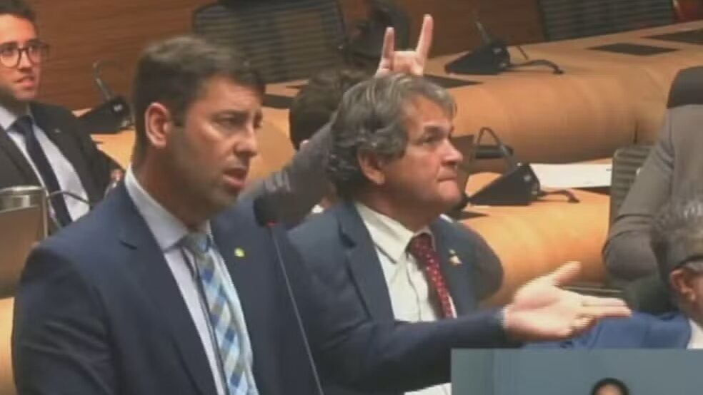 O vereador Eduardo Moura (Novo) foi filmado fazendo um gesto de “chifre” atrás da cabeça do colega Chico …