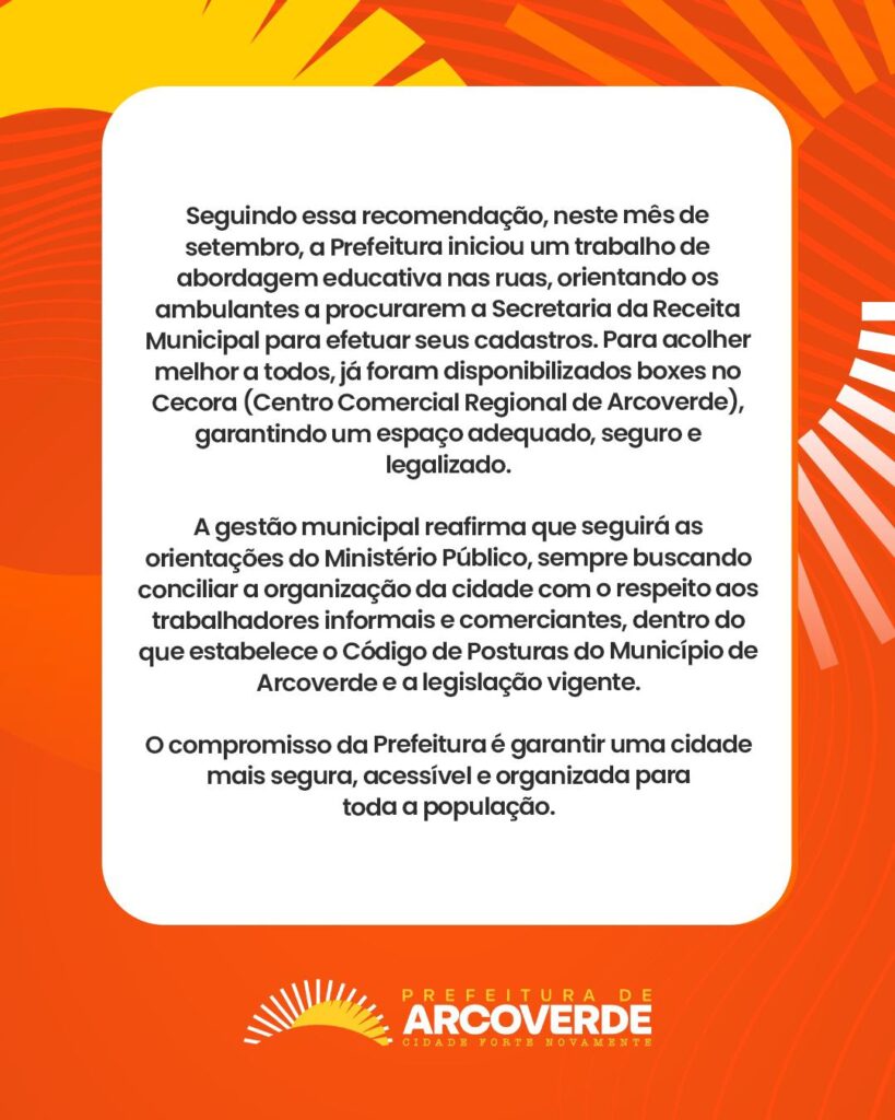 Seguindo essa recomendação, a Prefeitura explicou que iniciou, em setembro, um trabalho de abordagem educativa nas ruas, orientando os ambulantes a procurarem a Secretaria da Receita Municipal para efetuar seus cadastros. Além disso, informou que já foram disponibilizados boxes no Cecora (Centro Comercial Regional de Arcoverde), a fim de oferecer um espaço adequado, seguro e legalizado para os trabalhadores.