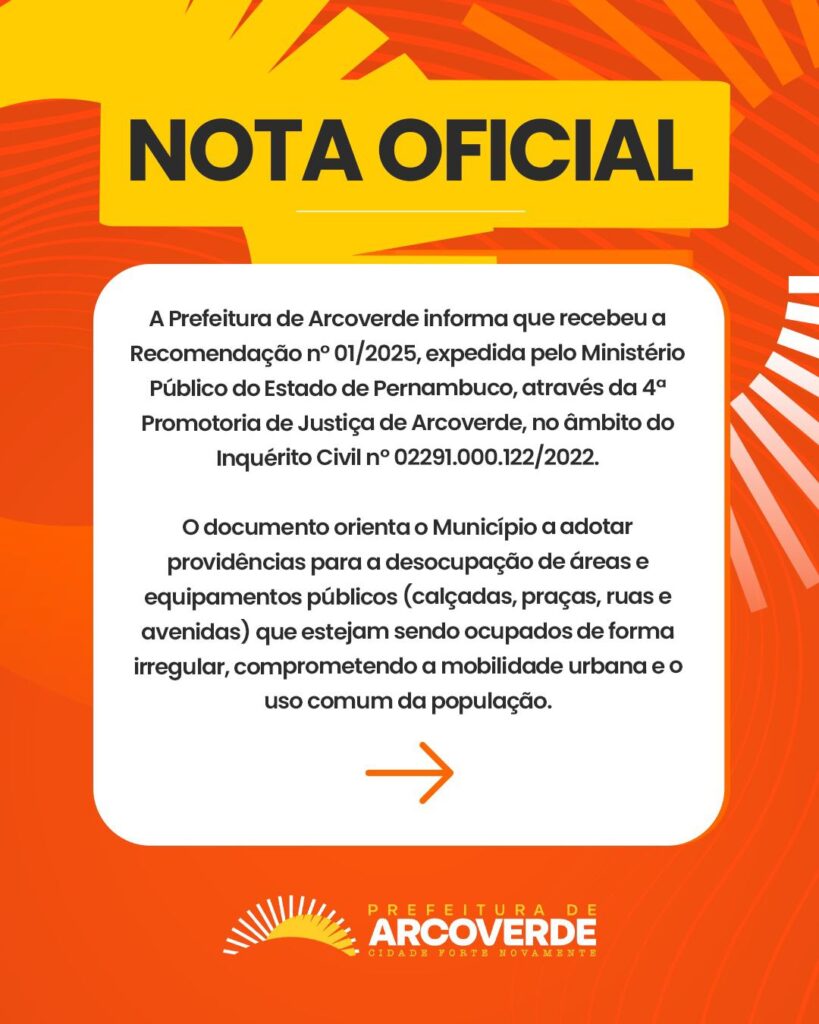 Diante da repercussão, a Prefeitura divulgou uma nota oficial, informando que recebeu a Recomendação nº 01/2025, expedida pelo Ministério Público do Estado de Pernambuco. Nesse sentido, por meio da 4ª Promotoria de Justiça de Arcoverde, dentro do Inquérito Civil nº 02291.000.122/2022. O documento orienta o município a adotar providências para a desocupação de áreas e equipamentos públicos — como calçadas, praças, ruas e avenidas — que estejam sendo ocupados de forma irregular, comprometendo a mobilidade urbana e o uso comum da população.