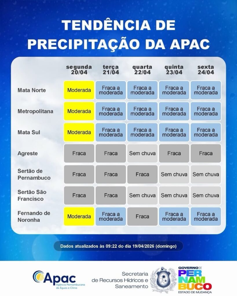 A Região Metropolitana do Recife e as zonas da Mata Norte e Sul devem registrar as chuvas mais intensas já nesta segunda-feira (20), com nível moderado e acumulados entre 30mm e 50mm. Entre a terça-feira (21) e a sexta-feira (24), a precipitação continua nessas áreas, mas com intensidade variando de fraca a moderada, com volumes entre 10mm e 30mm.