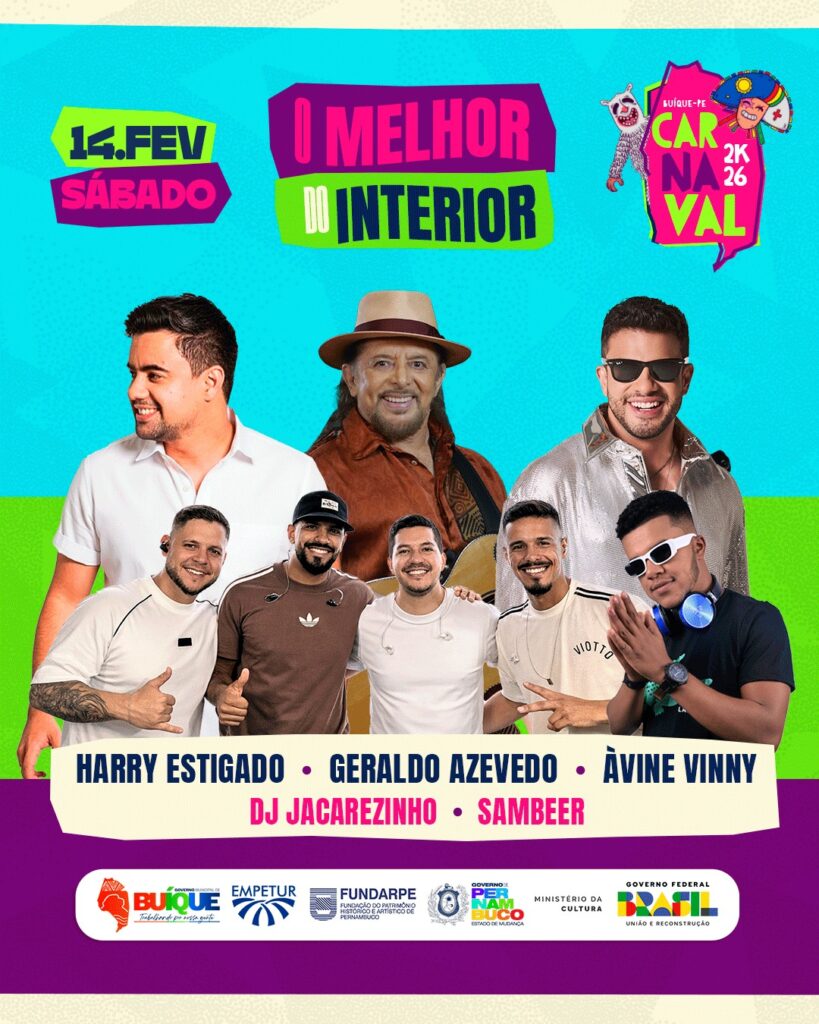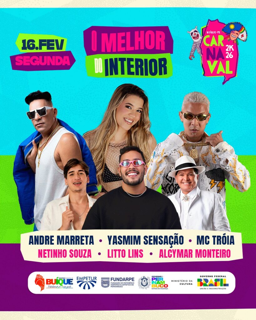 Na segunda-feira (16), a diversidade musical continua com Netinho Souza, Litto Lins, Alcymar Monteiro, MC Troia, André Marreta e Yasmin Sensação, reforçando a mistura de ritmos que faz do carnaval de Buíque um evento democrático e voltado para todos os públicos.
