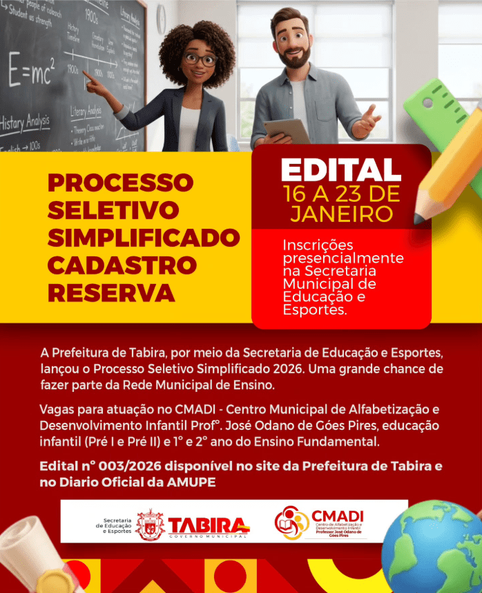 A seleção da Educação de Tabira para o ano letivo de 2026 já está com as inscrições abertas para o preenchimento de vagas estratégicas. Atualmente, a prefeitura busca fortalecer o quadro de profissionais da Rede Municipal de Ensino através da Secretaria de Educação e Esportes. A iniciativa visa contratar educadores qualificados para atuar diretamente no setor público do município. Além disso, o processo seletivo simplificado prioriza a renovação pedagógica nas salas de aula locais. Por consequência, os novos contratados ajudarão a elevar o nível do aprendizado nas unidades escolares.