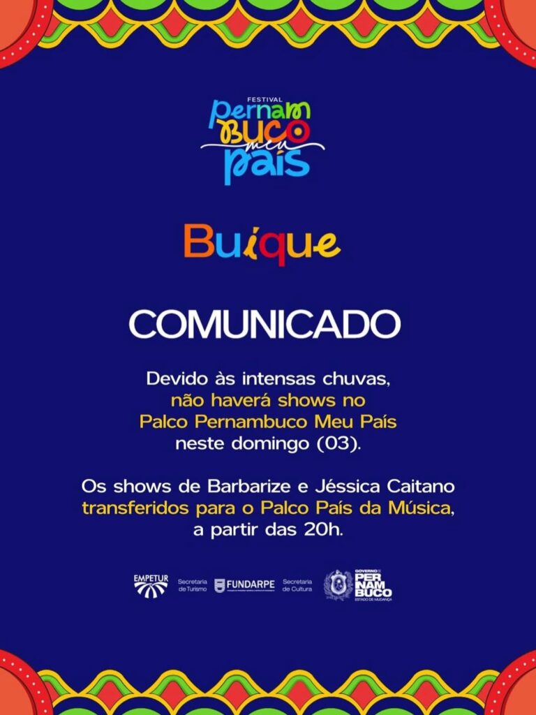 Devido às intensas chuvas que atingem o município de Buíque, o Palco Pernambuco Meu País não terá apresentações neste domingo (3)porque equipamentos imprescindíveis para os shows foram danificados.
