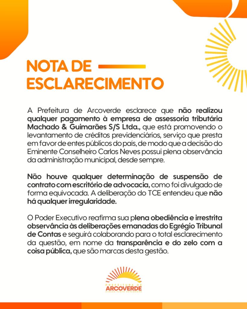Em resposta à decisão do TCE, a Prefeitura de Arcoverde divulgou nota oficial esclarecendo que não houve qualquer pagamento efetuado ao escritório Machado & Guimarães S/S Ltda. até o momento. Segundo o comunicado, a empresa está realizando o levantamento de créditos previdenciários. Serviço que presta a diversos entes públicos no país.